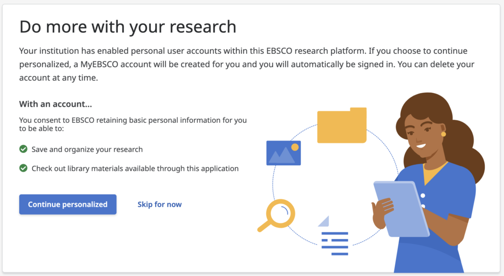 The page that loads with the library button will ask you whether or not you would like to create an EBSCO user account. This account is for personalization, such as saving searches or articles or later. You can select “skip for now” and decide later whether to use an account.